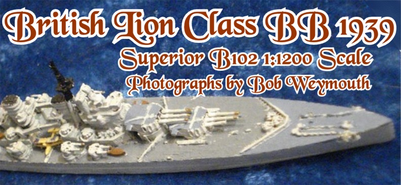 This is the British Lion Class BB 1939, produced by Superior in 1:1200 scale as model B102. As Britain was not prepared to go to the full 45,000 tons under the escalator clause of the most recent naval treaties, she designed this 40,500 ton vessel with a powerful armament of nine 16inch and a speed of 30 knots. Due to war priorities, this class was cancelled on the slips.
