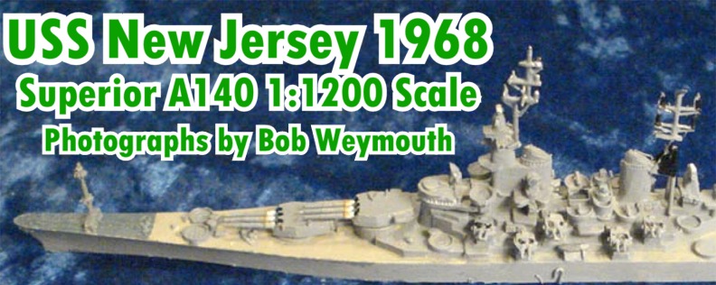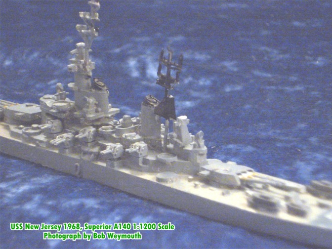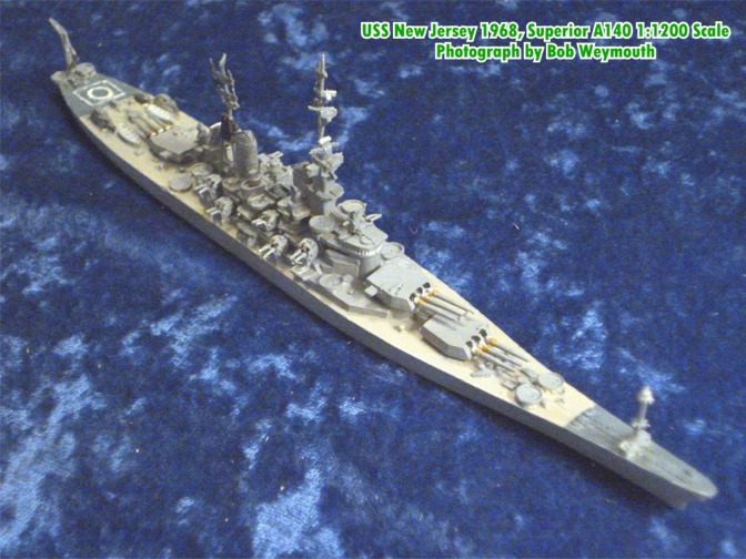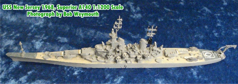 This is the Superior 1;1200 scale USS New Jersey 1968 (A140). Due to the heavy fighting in Vietnam, the US Navy withdrew this battleship from the Reserve Fleet in September 1967 and outfitted her for renewed service with the fleet. Her purpose was to bombard coastal areas of Vietnam where the Viet Cong and North Vietnamese army were operating. After spending 120 days on the gun line and one year in commission, she was returned to the Reserve Fleet by President Richard Nixon as a conciliatory gesture to the North Vietnamese delegation at the Paris Peace talks.
