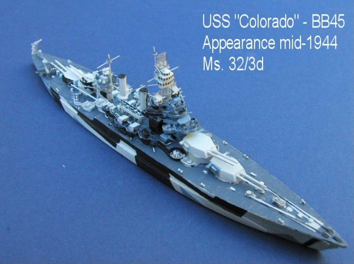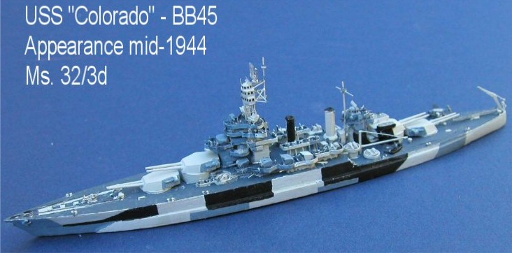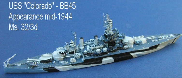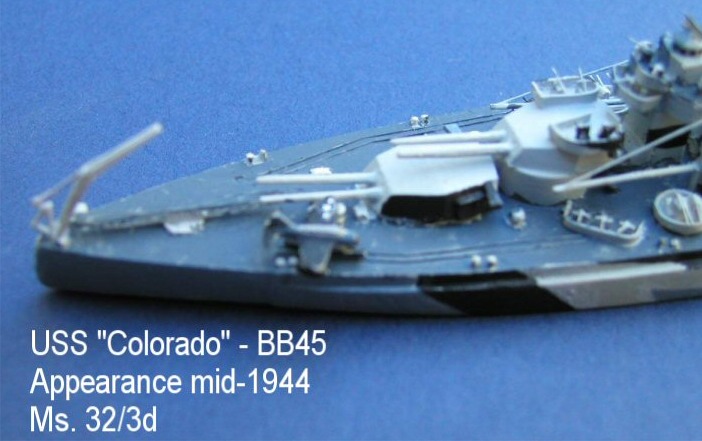 I decided to remake USS Colorado using the Morskie plans as a basis, which enabled me to add much more detail and to correct several very minor inaccuracies with the previous Colorado, which had been sold some time ago. The Kingfisher is a commercial product and is shown on one of the rails used on the quarterdeck to move planes to and from the catapult.